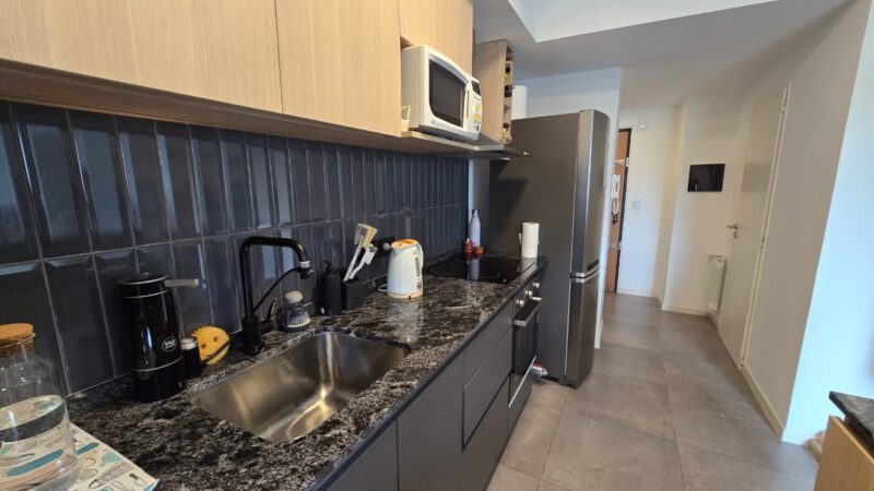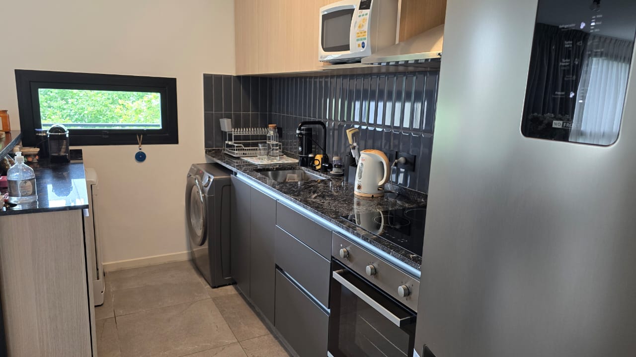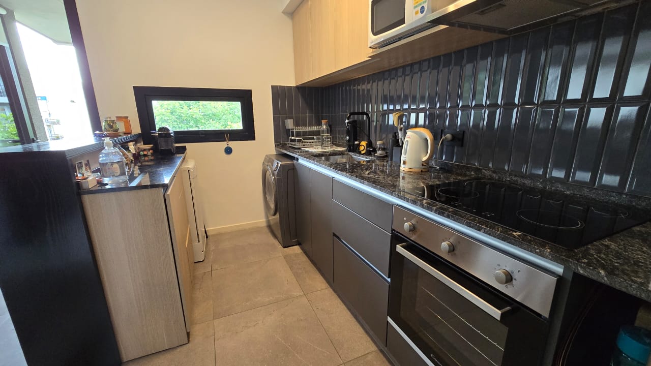 Cocina integrada al living comedor, con barra desayunadora, bajomesada y alacena de diseño, con gran espacio de guardado, horno y anafe eléctrico marca Candy, campana de acero inoxidable, con espacio para Lavarropas y lavavajillas .