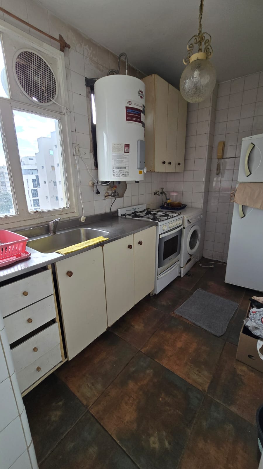 Cocina con alacena y bajo mesada, artefacto a gas, espacio para lavarropas.