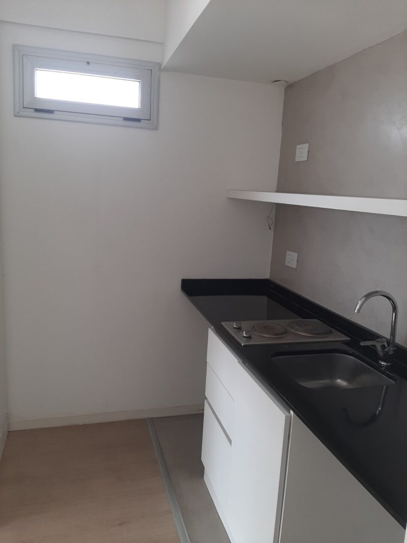 Cocina integrada con barra desayunadora, artefacto eléctrico, espacio para lavarropas bajo mesada.