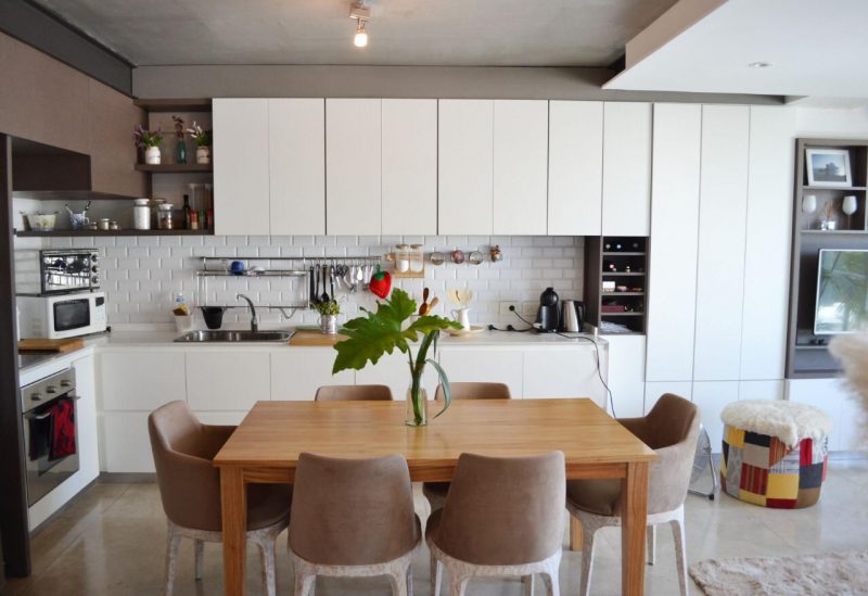 Primer planta : Amplio living comedor con cocina integrada, horno en acero inoxidable y anafe vitrocerámico con hermosos muebles de diseño.
